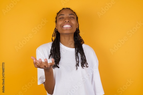 Young dark skinned woman with braids hair wearing white t-shirt over yellow background very happy and excited about new plans.