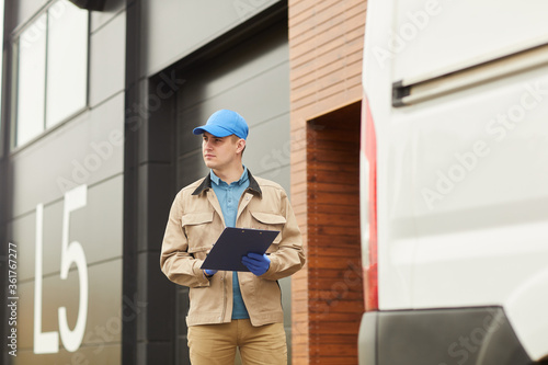 Young delivery person in uniform working with loads in warehouse outdoors