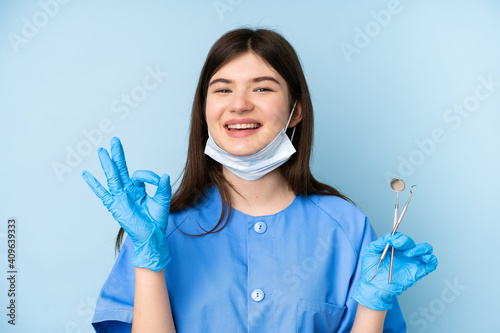 Young dentist woman holding tools over isolated blue background showing an ok sign with fingers
