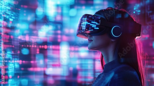 headset, futuristic, neon, workspace, holographic, aesthetic, glow, technology, innovation, digital, lifestyle, modern, advanced, professional, lighting, detailed, ultra, hd, virtual, reality, gaming, tech, science fiction, woman, diverse, young, glowing, light, floating, screen, high technology, concept, creative, dynamic, bright, dark, contrast, stylish, cool, trend, cutting edge, design, visual