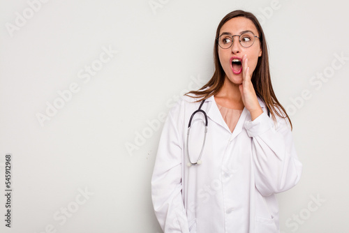 Young doctor woman isolated on white background is saying a secret hot braking news and looking aside