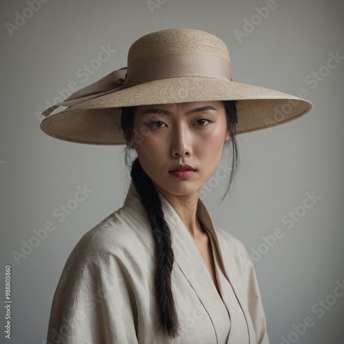 Young East Asian woman with long dark hair wearing large beige sun hat
