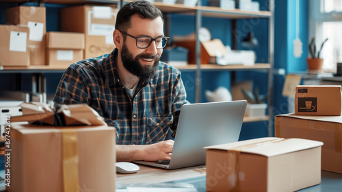 Young entrepreneur working on a laptop in a stylish home office, surrounded by packaging boxes and plants, focused on online business.
