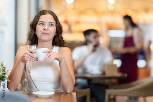 Young European woman enjoys a cup of hot quality coffee made from Arabica beans. Woman enjoys drinking cappuccino in a coffee shop