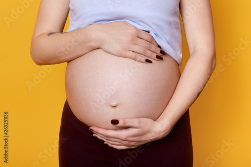 Young faceless pregnant woman holds her big belly with hand isolated over yellow background. Pregnant model being photographed in photo studio. Future mother expects baby and posing with bare abdomen.