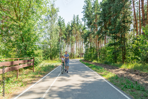 Young father with his little daughter on bicycle in summer sunny forest