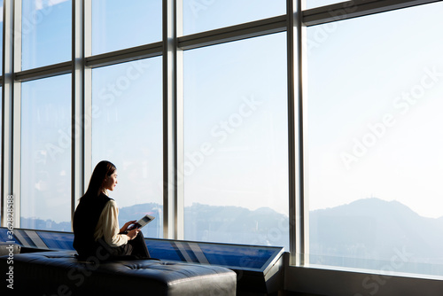 Young female business worker is using digital tablet for searching information in internet for her presentation at conference, while is sitting in skyscraper office interior near window with city view