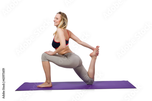 Young female doing exercises on white