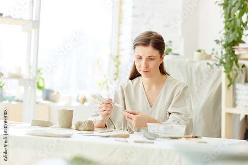 artisan, business, craft, creative, creativity, handcraft, hobby, labor, woman, manufacturer, master, occupation, pitcher, potter, pottery, profession, self employed, skill, small, workshop, owner, workroom, contemporary, young, adult, earthenware, workplace, working, talented, produce, clay, ceramic