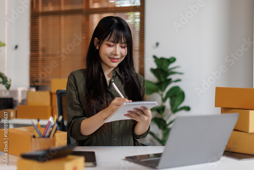 Young female small business sme owner Startup SME small business entrepreneur SME or freelance making expenses at her store.