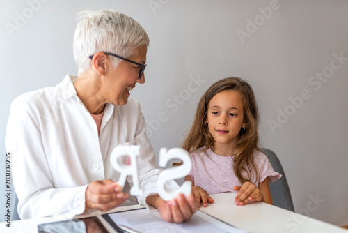 Young female speech therapist helping a young patient. Session with alphabet learning. Girl visiting speech therapist. Female therapist helping girl in speech therapy exercise.