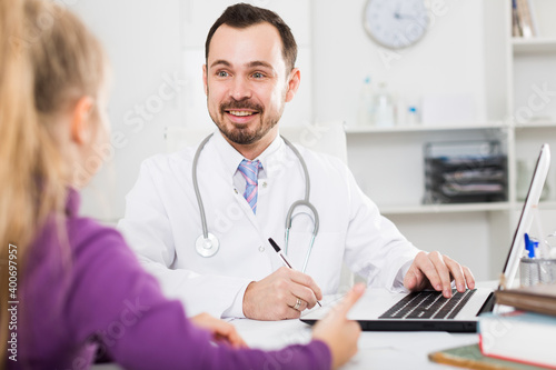female, teenage, client, visitor, patient, male, doctor, professional, consulting, visit, hospital, medicine, center, room, office, indoor, children, girl, man, guy, young, adult, white, caucasian, european, 2, people, problem, disease, clinic, medicals, treatment, procedure, health, well-being, stethoscope, thermometer, diagnostic, diagnosis, decision, care, attention, service, responsibility, assistance, help