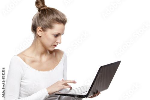 Young female working on laptop isolated on white background