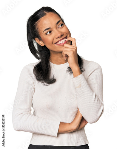 face, happy, pondering, contemplation, calm, meditating, carefree, thoughtful, thinking, copy space, imagination, smiling, problem, expression, idea, inspiration, cheerful, planning, confident, trouble, filipina, woman, young, studio, background, portrait, fashion, style, modern, trendy, chic, professional, casual attire, elegant, pose, model, photo, session, youthful, diverse, cultural, attractive, appearance, urban, adult