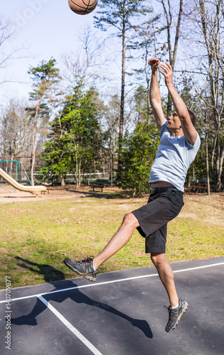 Young fit muscular man jumping up throwing basketball into hoop
