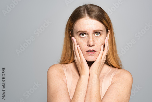 Young freckled woman touching face and looking at camera isolated on grey.