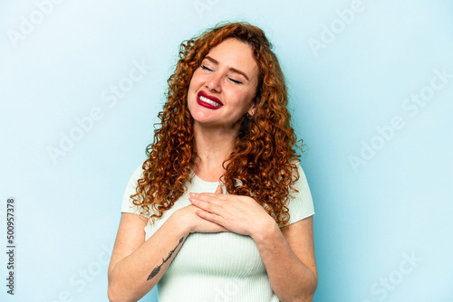 Young ginger caucasian woman isolated on blue background laughing keeping hands on heart, concept of happiness.