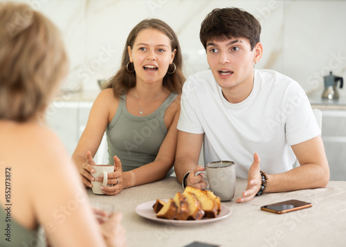 Young girl and guy have nice conversation with woman, mom, during Sunday tea party