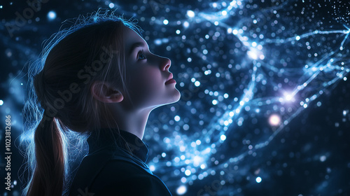 Young Girl Gazing at Glowing Stars and Cosmic Networks in a Futuristic Sky