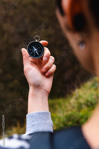young girl holding a compass in hand, ready to travel, keep calm. Tourism, traveling, hiking and healthy lifestyle concept.