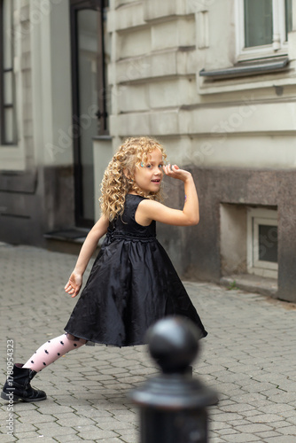 girl, black dress, curly hair, city street, sidewalk, confidence, children, fashion, urban, fun, footwear, smiling, expression, playful, portrait, lifestyle, youth, elegance, joy, summer, personality, candid, celebration, charme, movement, energy, style, innocence, posing, happiness, creativity, light, cute, whimsical, humor, casual attire