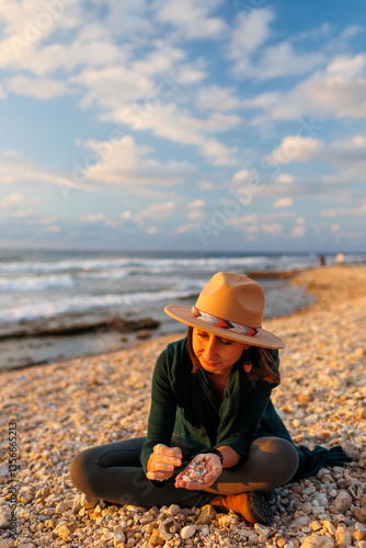 young girl in a hat sits on the beach and collects various shells. collection of shells.