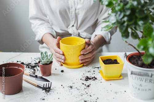Young girl is engaged in gardening at home. The gardener girl is holding a yellow pot. Land and garden tools