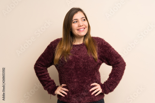 girl, woman, woman, people, person, lady, female, casual attire, youth, young, hispanic, caucasian, brunette, background, wall, isolated, happy, hand, hip, success, proud, haughty, arm, smile, style, expression, confident, arm, smiling, portrait, face, positive, fun, happiness, lifestyle, laughing