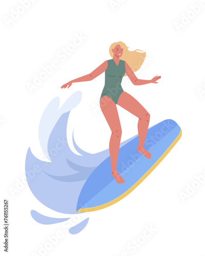 wave, surfer, woman, summer, surfing, surfboard, girl, active, person, ocean, vector, ride, beach, sport, sea, young, happy, standing, hobby, people, extreme, illustration, surf, board, flat, vacation, swimwear, water, cartoon, resort, catch, character, female, water sport, isolated, outdoors, activity, leisure, travel, swim, recreation, background, swimwear, holiday, bikini, summer, design, enjoy, fun, tropical