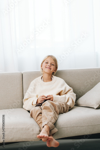 children, girl, children, youth, person, sitting, sofa, couch, seat, living room, living, room, interior, home, house, cosy, warm, soft, sweater, knit up, cream, beige, neutral, light, bright, sunlight, window, curtain, smile, relaxed, casual attire, foot, barefoot beach, comfort, portrait, lifestyle, mood, ambience, texture, fabric, cushion, pillow, calm, serene, family, decor, space
