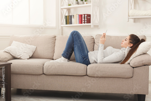 Young girl using mobile phone on sofa