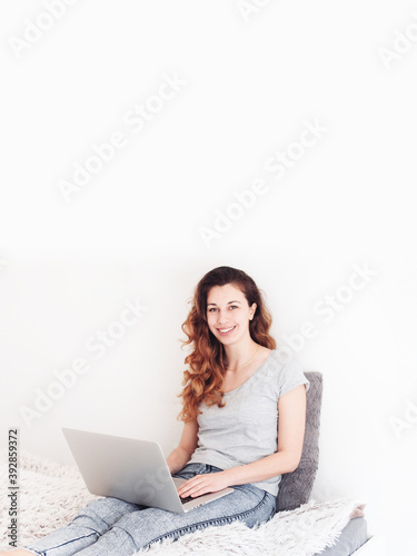 Young girl with a grey laptop sitting on a bed, white space on the background. The woman has long hair, looks happy and content