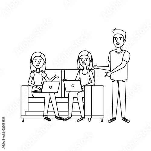 young girls on the sofa with laptops and man