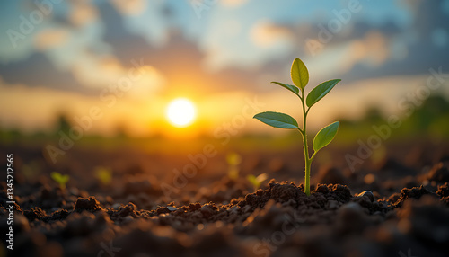 Young Green Plant Growing in Soil at Sunrise - Nature, Growth & Sustainability Concept