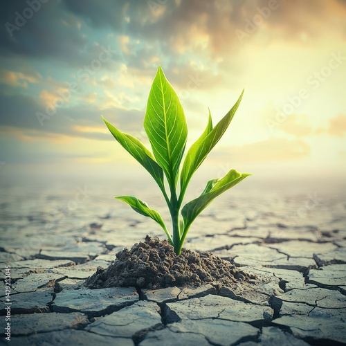 Young green plant sprouting from dark soil in cracked dry landscape under sunlit sky