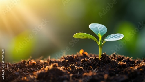 Young green sprout emerging from rich soil with warm sunlight