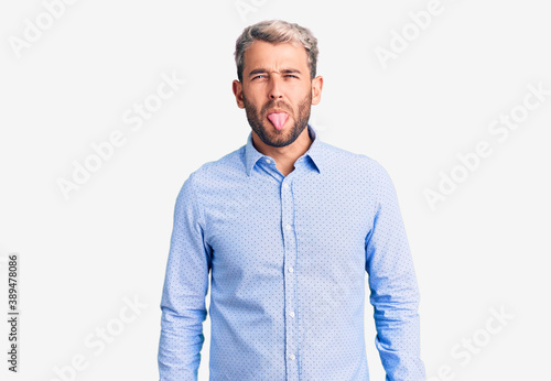 Young handsome blond man wearing elegant shirt sticking tongue out happy with funny expression. emotion concept.