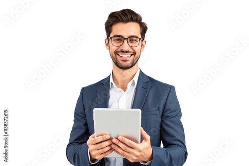 businessman, business, man, male, tab, tablet, smiling, holding, isolated, transparent, photogenic, white, smile, goggles, suit, businessperson, technology, professional, men at work, portrait, eyeglass, happy, cut-out, work, people, person, success, office, studio, executive