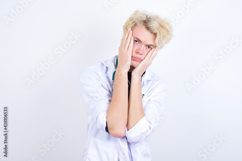 young handsome Caucasian doctor man standing against white background holding head in hands with unhappy expression watching sad movie about animals and trying not to cry.