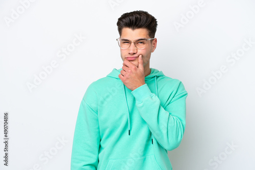 Young handsome caucasian man isolated on white bakcground having doubts