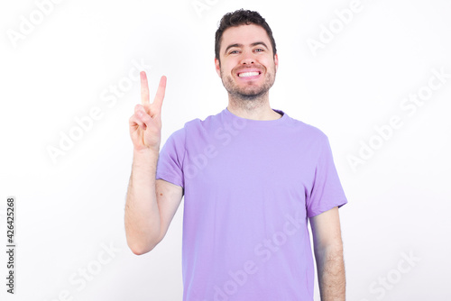 young handsome caucasian man wearing purple t-shirt against white background showing and pointing up with fingers number two while smiling confident and happy.