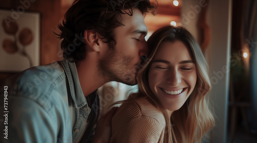 Young handsome father kissing his wife in house with romantic dim light scene .