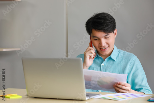 Young handsome male businessman with black short hair wearing light blue shirt working on office desk with silver laptop by looking at work document while using red mobile phone