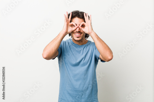 approval, expression, eye, face, finger, friendly, fun, funny, gesture, hand, happy, joyful, looking, ok, ok, posing, positive, showing, signs, isolated, adult, arm, attractive, beard, blue, casual attire, caucasian, cheerful, confidence, confident, guy, coiffure, hand, photogenic, lifestyle, long hair, male, man, modern, 1, person, portrait, smiling, standing, studio, white, young