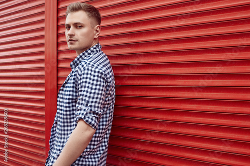 beauty, caucasian, red, trendy, casual attire, season, attractive, model, sneaker, jean, blond, shirt, coiffure, background, person, clothing, adult, male, sexy, photogenic, brutal, hipster, guy, young, street, man, europa, cool, vogue, lifestyle, stylish, outdoors, wall, posing, fashion, american, white, gate, wearing, colours, elegant, cute, smiling, arm, healthy, strong, relax, student, holiday