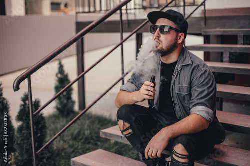 steam, vapour, taste, urban, fun, smartphone, to sit, brutal, rapper, hipster, city, contraption, modern, street, photogenic, young, nicotine, business, portrait, electric, bad, sunglasses, toxic, lifestyle, smoke, cigarette, male, fashion, posing, health, electronic, man, adult, background, casual attire, habit, smoker, cloud, black, cap, healthy, 1, cool, rust