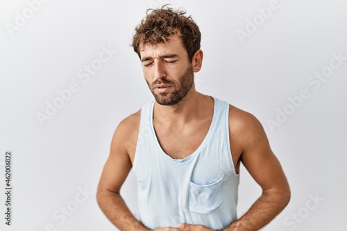 Young handsome man standing over isolated background with hand on stomach because indigestion, painful illness feeling unwell. ache concept.