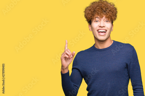 Young handsome man with afro hair pointing finger up with successful idea. Exited and happy. Number one.