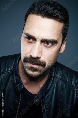 man, boy, studio, photogenic, model, young, moustache, beard, sexy, concept, conceptual, portrait, face, expression, caucasian, white, adult, background, casual attire, attractive, turkish, guy, masculine, muscle, muscular, body, gesture, abs, chest, hairy, t-shirt, jean, torso, fit, fitness, healthy, 30s, macho, beauty, beautiful, confident, strong, athletic, leather jacket, happy, black, lifestyle