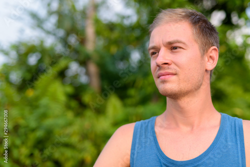 man, adult, attractive, bangkok, beard, blond, blue, casual attire, city, conservation, environment, environmental, garden, green, guy, hair, photogenic, landscape, male, man, mid, people, person, portrait, rooftop, shirt, short, sleeveless, stubble field, tank, terrace, siam, thinks, thinking, top, young